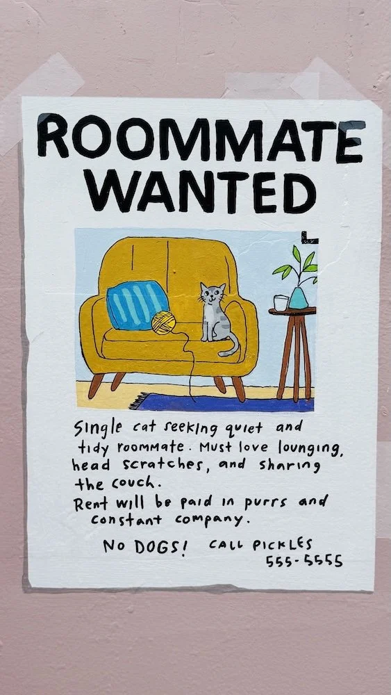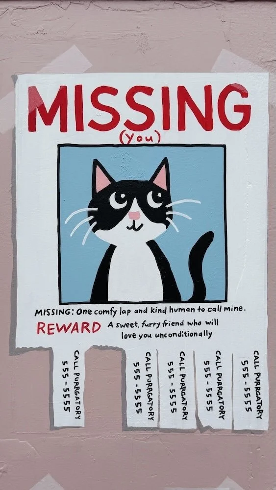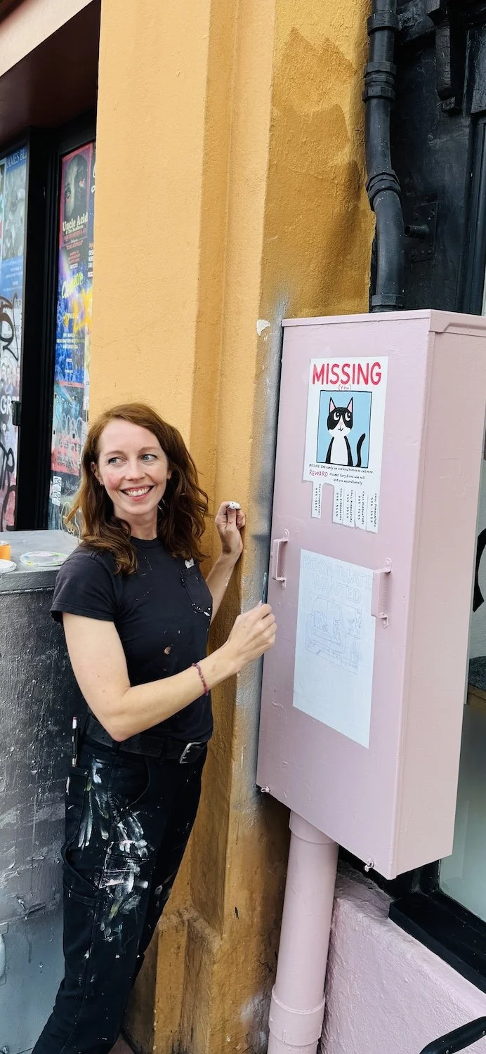 Outside, I transformed a drab gray utility box into a sweet bulletin board for local cats. One kitten is missing (you), and the other is hoping to find a kind human companion for quiet times at home. Both murals highlight what Purrgatory is all about, helping these sweet kitties find their people.