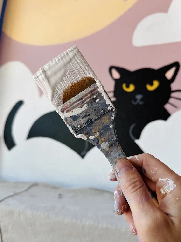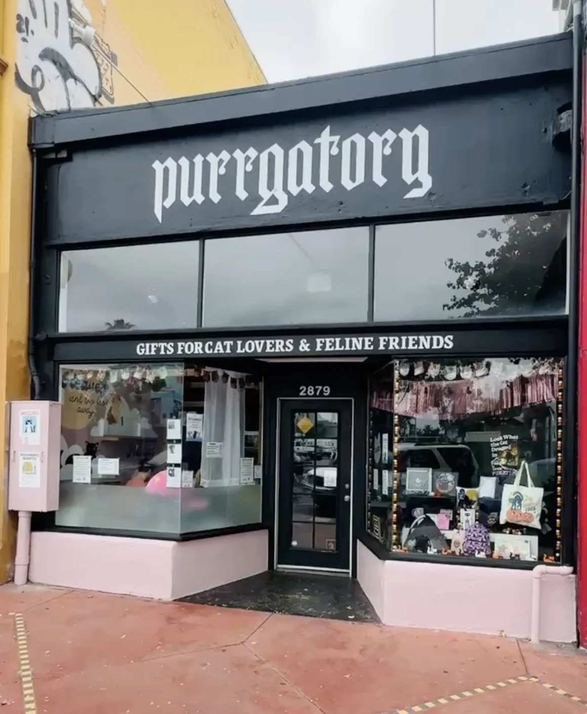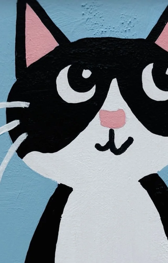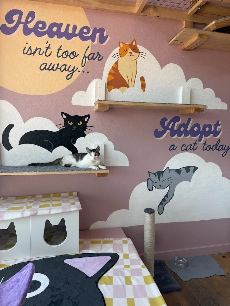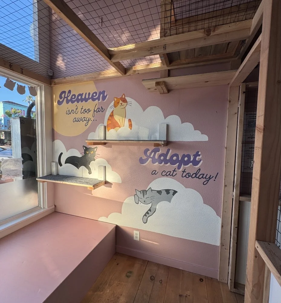 I teamed up with Vera, the creative force behind Purrgatory to bring some playful feline magic to this cat themed North Park shop. We created a mural for the “catio”, the sunny little lounge where you can peek in and admire some adorable adoptable cats.